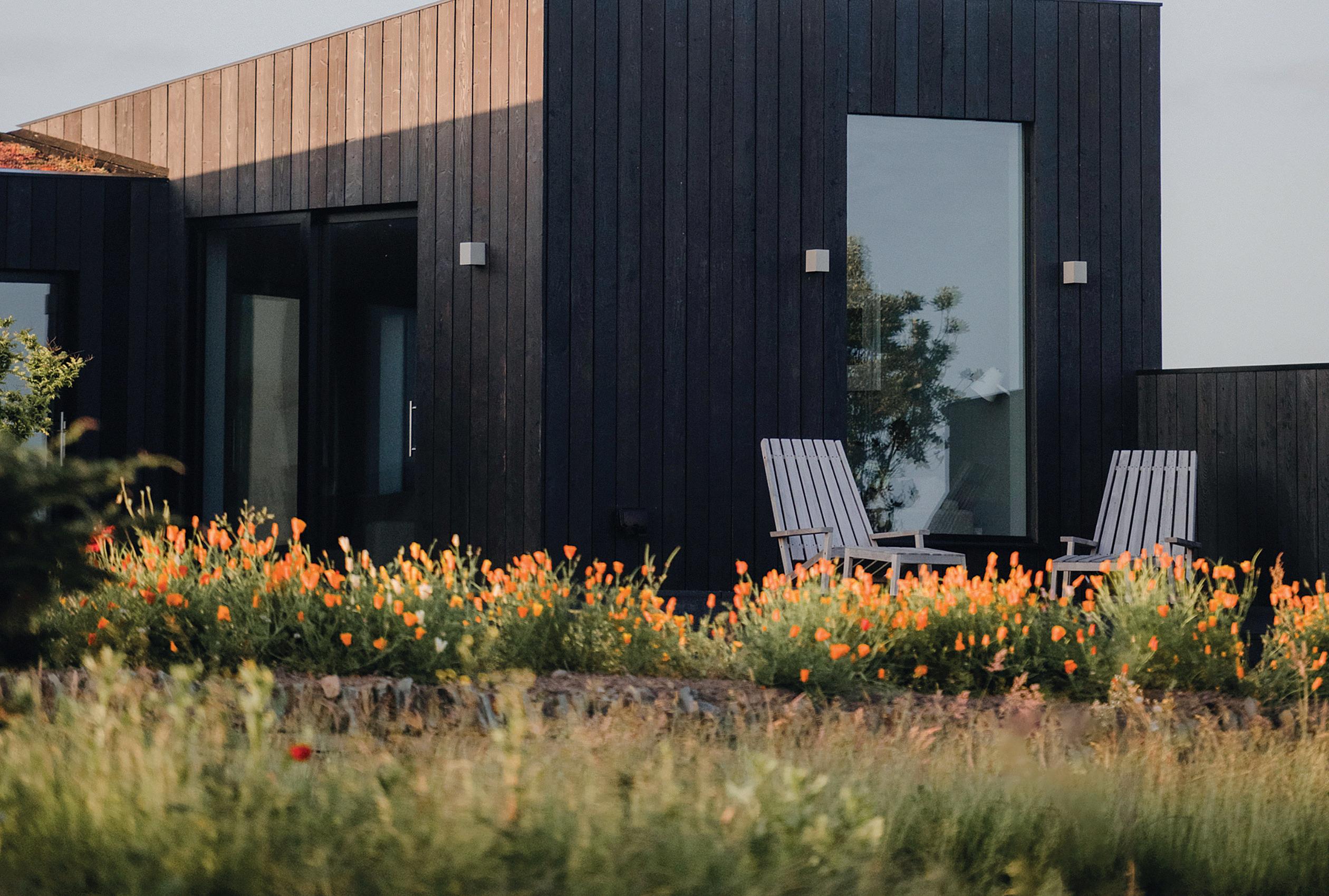 Each lodge is designed for complete immersion. Oversized beds are dressed in natural linens and Egyptian cotton. Seating is low, textural and inviting. Thoughtful details – a mini-bar stocked with Cornish produce, interconnecting gates for families or friends staying side-by-side – reveal a guest experience that feels considered but never contrived.