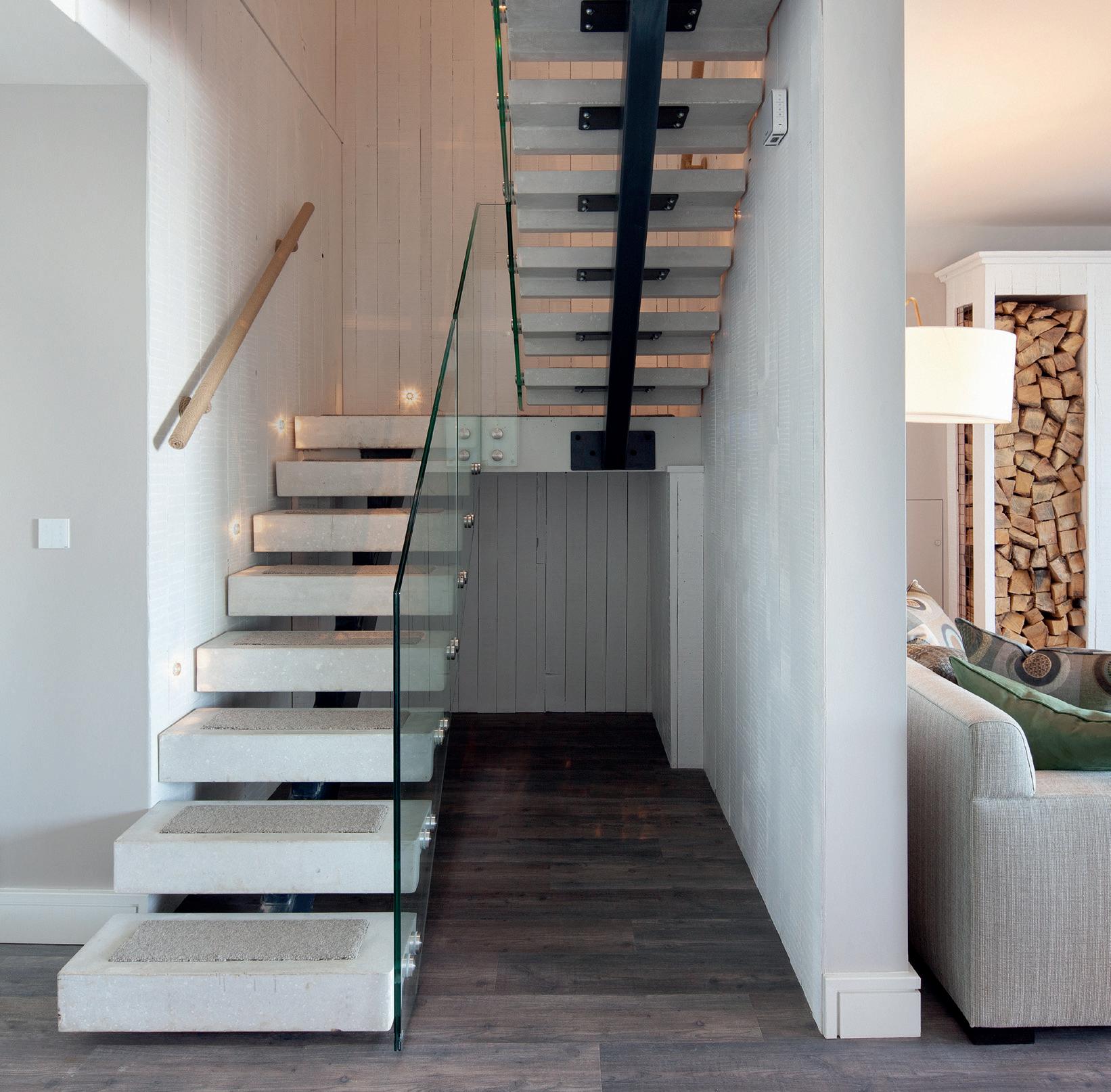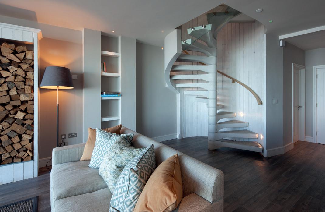 Materials are selected for both their aesthetic and structural potential. The company works confidently with steel, stainless steel, hardwoods, concrete, glass and stone, with bespoke finishes that include powder coating, polishing, lacquering and custom sprays. As open plan living spaces have become more and more popular, Spiral UK have been faced with the design dilemma of how to introduce a staircase without encroaching on the space? The solution is a bespoke spiral stair, tucked into a corner providing all the function of a straight stair without taking up too much of the room. A staircase in point was installed into a holiday let in Carbis Bay. Light white-faced concrete was used as it’s suitably heavy in structure but light in form, with open risers and glass balustrade. This fitted in with the subtle seaside theme and