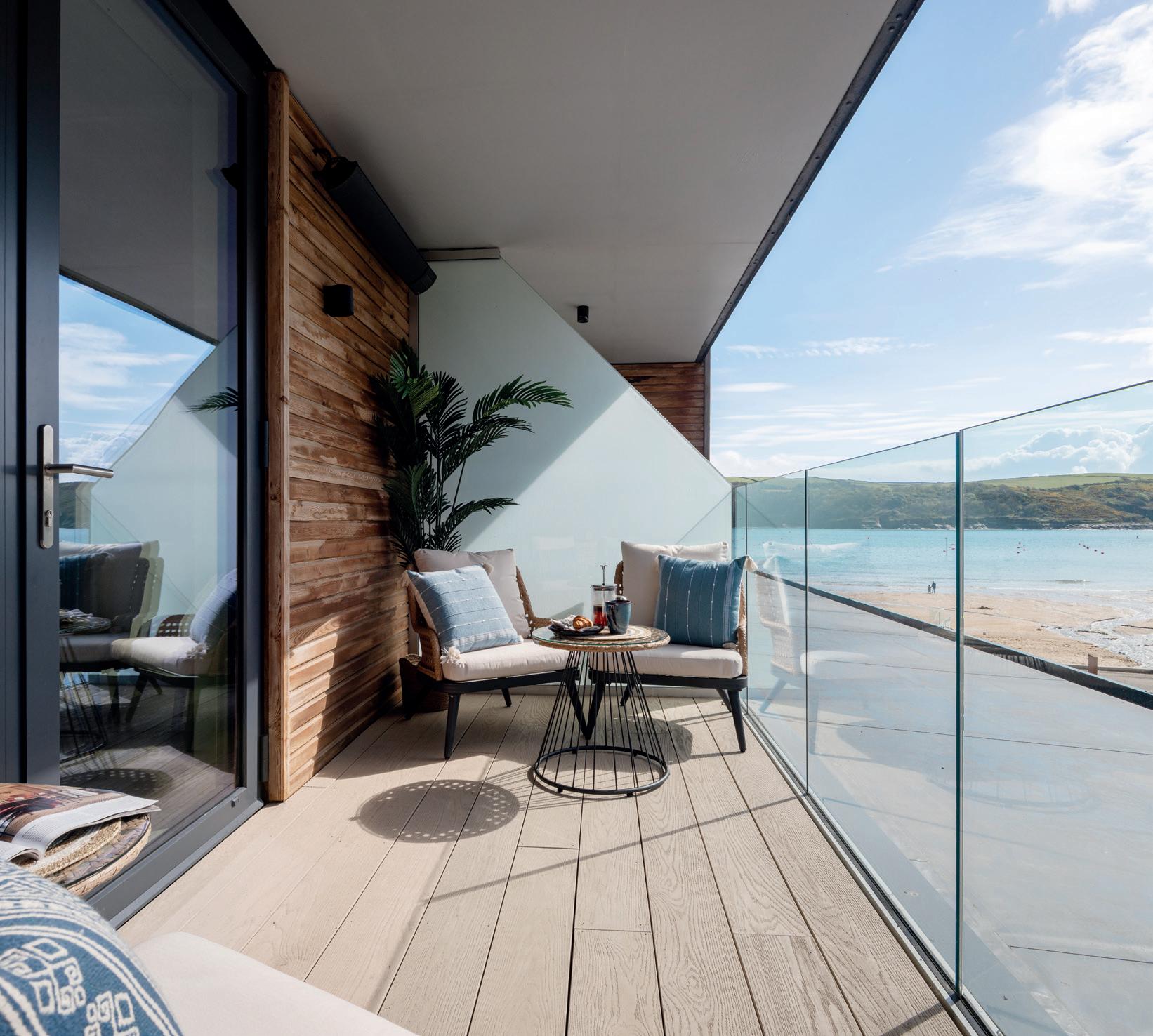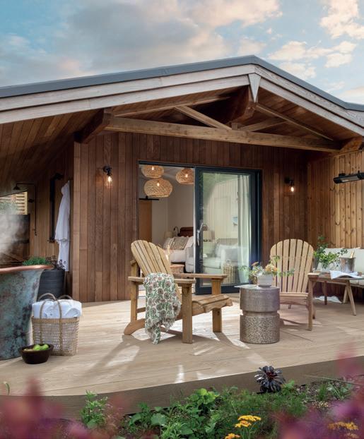 are low-slung and secluded, each one a softly minimalist retreat. Interiors lean into natural materials and weathered tones, while outside, private decks feature oversized copper baths and open-air showers framed by bamboo and agapanthus. It’s luxury on Cornwall’s terms providing outdoor living that acknowledges both the rawness and the softness of the British coast.