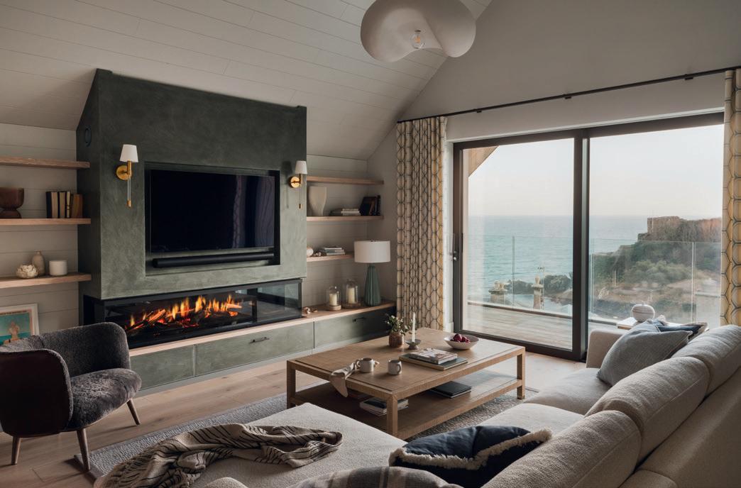 In contrast, the Rock project, built by a developer and brought to life by Cornish Interiors, plays in a more contemporary register. Originally very much a blank canvas, it was transformed into a warm, textural haven for a young family. Free from architectural legacy, it became a clean slate for experimentation. The team added character and focal points by installing a fireplace, curated bespoke shelving and sourced statement pieces.