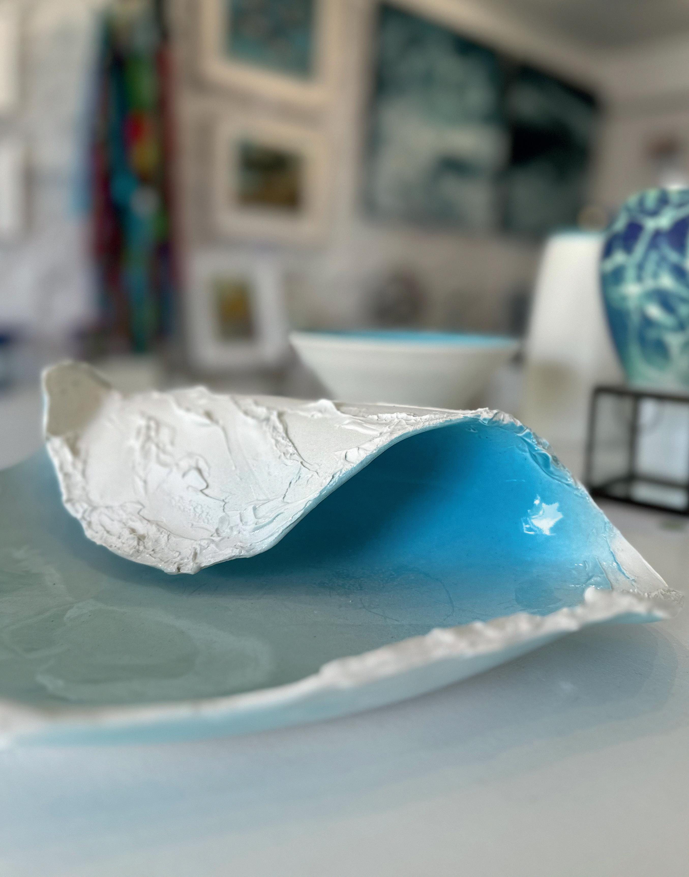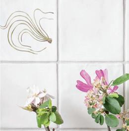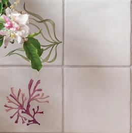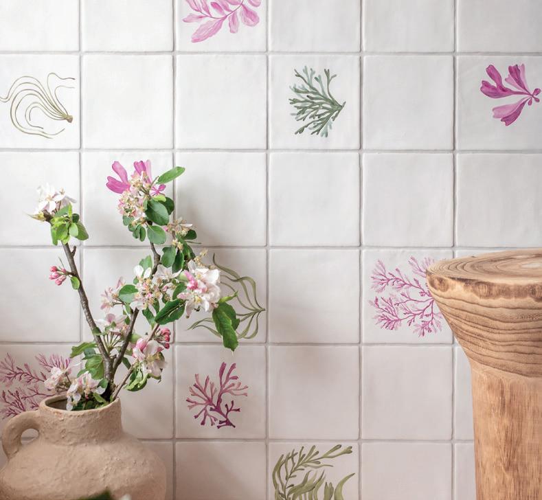 sometimes years, to master. The studio’s output is both wide-ranging and precise. Some clients commission statement murals for restaurants, others request gentle, repeating motifs that reference seaweed, sand, and the lines of the tide. Collections such as Harbour and Seaweed speak clearly of place, echoes of the coast captured in glazes of pink, blue and moss green.