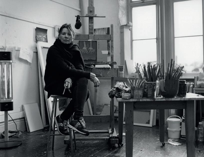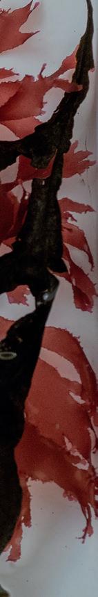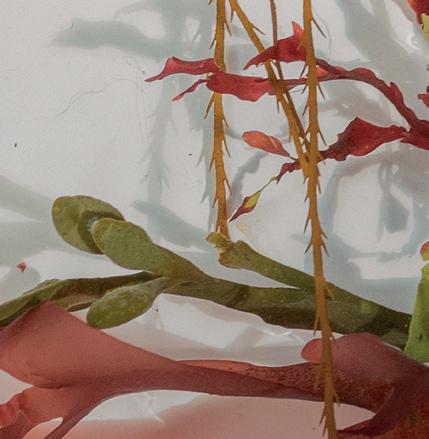 Darkness also stalks her latest innovation. Suspended overhead at her London show are an array of weird and bulbous coloured objects. Limpet shells encrust bodies that trail tentaclelike strands. They momentarily flip the groundfloor gallery, where Bealing’s coral paintings hang against walls painted black, into a vision of the watery depths. Collectively called Deadman’s Fingers, the installation is improvised from discarded small boat fenders collected by her partner and sons on beaches around the Lizard. “They came about so naturally I am selfconscious about calling them sculptures,” she explains. Adopting three dimensions is a bold move for any painter, but Bealing, an artist constantly moving her practice forward, makes the transformation joyously with another wry twist in interpretation. This time the direction is reversed and sinister connotations soon give way to play.