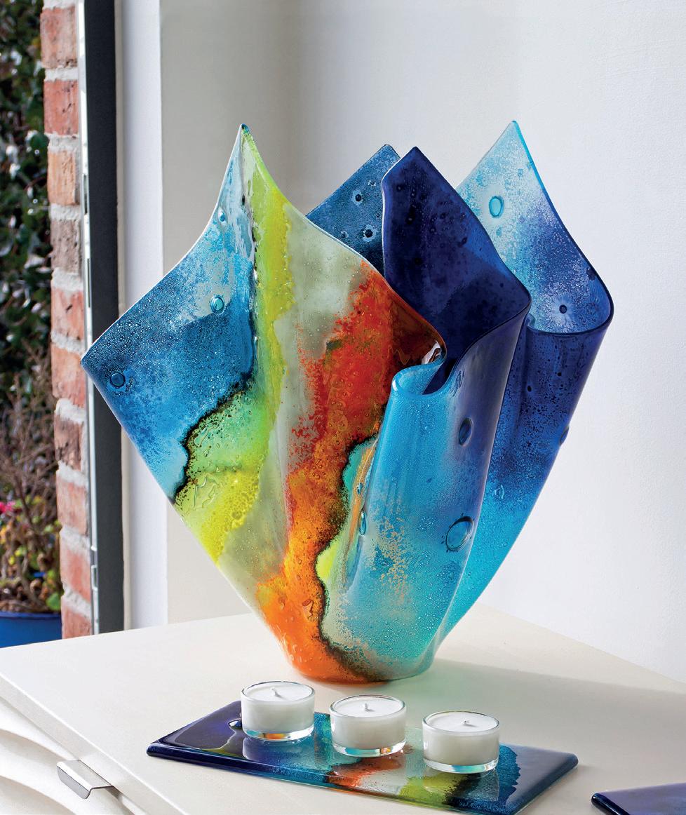 Beginning with the pure white of Cornish sands, her palette extends through the dazzling blues of the Atlantic Ocean, to the golds and flaming reds of a sunset in a clear blue sky. The lovely, liquid quality of Jo’s designs, which allow the ripples and bubbles of the fusing process to shine through, make her glass glow with colour and texture. The Cornish Sunset collection includes coasters, candle stands, vases, dishes, mirrors and more, and is available from mid-March online, at Jo’s Cornwall galleries and at Jo Downs Handmade Glass Gallery Sunningdale, which has become her flagship venue for the display of new designs. You can also see the new Cornish Sunset collection, alongside pieces from other Jo Downs ranges, at the Craft in Focus event at RHS Garden Wisley from 27th April to 1st May.