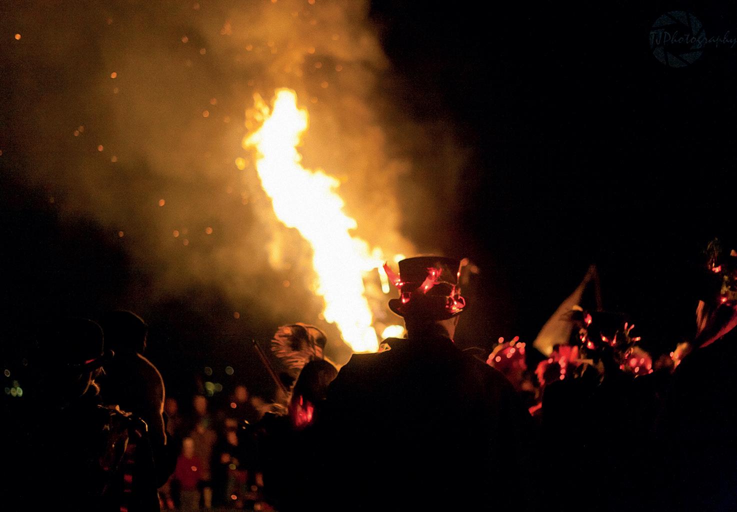 costumes. Several fire beacons are lit throughout the town, leading up to the chalking and burning of the Cornish Yule log and the dancing that follows. With a theme of ‘light and darkness’, everyone is encouraged to unite on the longest night of the year in defeating the darkness and celebrating the annual return of the light.
