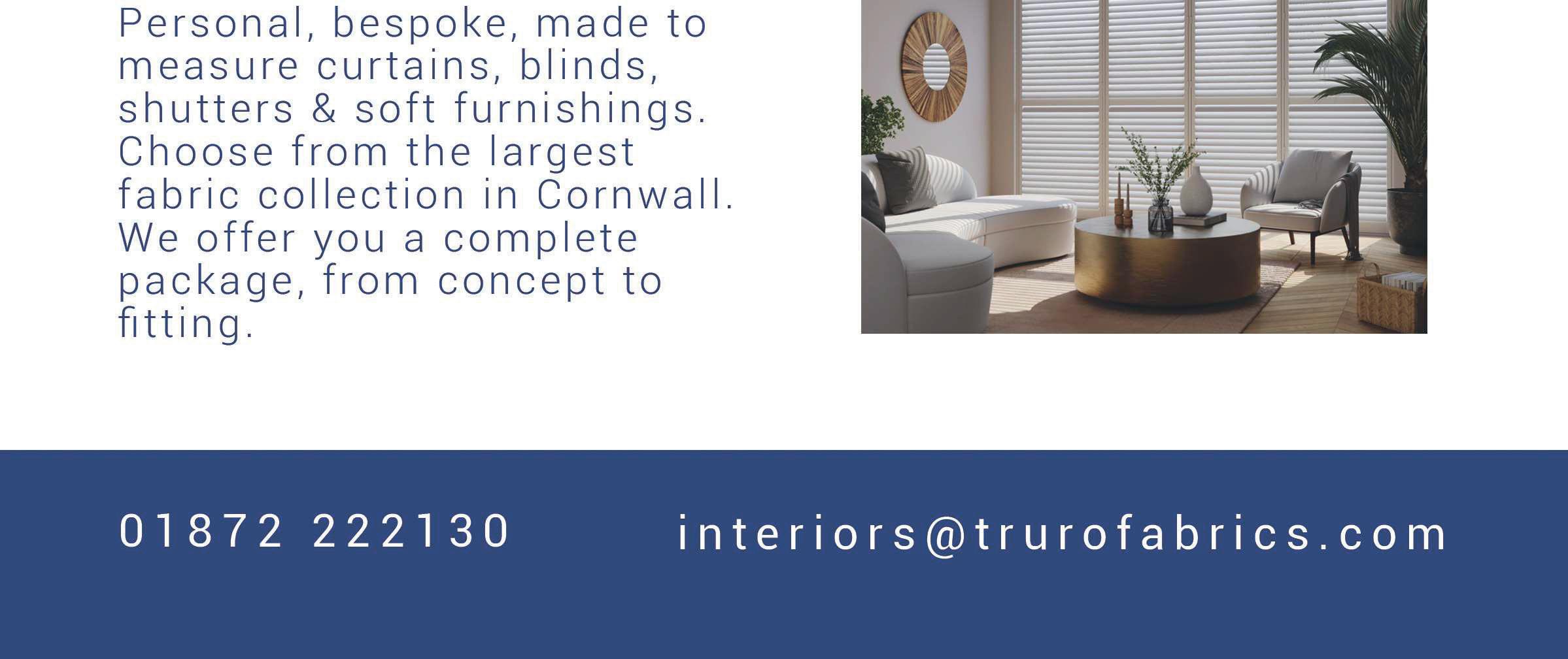 Local Independent Flooring Specialists Westwood-Frame Carpets 15b Killigrew St, Falmouth Moor, Falmouth TR11 3PN Tel: 01326 313352 www.westwood-frame.co.uk Amtico Karndean Sisal & Coir Crucial Trading Roger Oates Unnatural Flooring Wood Floors Custom Window Blinds Axminsters Brintons VERANDAS • CARPORTS • GLASS ROOMS • PERGOLAS PRICE PROMISE It’s simple, we will never be beaten on price • All year round barbeques and parties • Children can play outdoors come rain or shine • Cats and Dogs love the cover • Patio tables and chairs stay dry - No need to store away for most of the year • Any colour and any size to suit you and your property • Supply and install or Supply only • D.I.Y kits available - Trade Discounts For a FREE quotation or brochure call Truro 01872 470210 or visit www.allweathercanopies.co.uk ENHANCE YOUR HOME With premium window shutters Book a FREE home visit today! 01637 849 153 Scan me to visit our website! A5 landscape_2023_august23.indd 1 02/08/2023 12:26:23