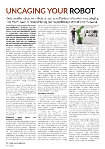 robot works and the operational areas it can and can’t enter, programme your robot to slow down as it approaches a hazard rather than coming to an abrupt standstill, and even introduce presence-sensing detection. Above all, the newest robotic software is enabling manufacturers to think more creatively around how automation equipment is deployed and how companies can boost production efficiencies whilst also saving space in valuable commercial real estate. “Safety risks vary depending on the selected robot and application,” emphasises Steve. “One of the key advantages of being able to embed more of the safety-related functions into the robot controller is you can design out the various safety hazards whilst also eliminating the need for external fixtures or mechanical devices to supply this functionality. FANUC recently demonstrated an example of a fenceless robot cell in collaboration with Rockwell Automation. In this showcase, Rockwell safety laser scanners were installed close to floor scanning horizontally for any approach to the system. As an intrusion got closer, these scanners informed the robot system to operate slower. Additional mini scanners were concealed under the FANUC robot system mounting, providing an invisible shield and initiating the robot to stop when the box of light is encroached. Setting your safe limits Many of these developments, including FANUC’s Dual Check Safety (DCS) Position & Speed Check solutions, were initiated in the automotive sector on FANUC CNC robots. However, the trend for built in logic and safety motion is rapidly spilling into other markets, including packaging and palletising, claims Steve. In addition to meeting the safety requirements for electronic control systems, DCS Speed and Position Check offers significant benefits to applications where the travel of the robot needs to be restricted due to floor space or process limits that are less than the full reach of the robot. Restricting the robot motion in Cartesian space means the robot can be restrained to exactly designated safe area in which it works; something that is not possible with systems that limit robot motion externally using limit switches. What’s more, this software works across the whole robot model, not just a single