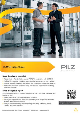 More than just a report A PUWER Inspection from Pilz can offer you more than just a report containing your results, we can; • Present our findings to you and your team in person • Deliver your inspection data in an Excel format for you to analyse and distribute amongst departments and teams • Offer you a complete safety services package including CE Marking, Safety Concept and Safety Validation Pilz Automation Technology Corby NN18 8TJ