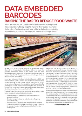 So how can a barcode help in the drive to reduce food waste? Currently in the distribution chain before delivery to store, the barcoded information already on the pallets, cases and trays provides visibility and accurate knowledge about where products are, and what shelf life they possess. However, once they are in store the retailer loses that visibility. A new type of barcode (the Data Embedded Barcode or DEB) has been introduced which is printed onto the item of sale. In addition to identifying the product, as the existing barcode does, it also contains the expiry date and possibly batch identification data. By scanning this barcode in store when stocking the shelf as well as at the checkout, the retailer acquires real time information about what stock is on the shelf and how much life it has left. Intelligent use of this information creates the opportunity to make better decisions to reduce food waste, including • Smarter rotation of stock in store, ensuring shortest life product is sold first • Smarter management of price reductions to sell expiring product efficiently • Prevention of out of date product being sold at the checkout • Smarter forecasting of demand to drive more efficient ordering to re-stock the store, taking into account the life left on the existing stock 6 - Automation Update