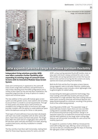 Stuart Reynolds of AKW, said: “The expanded range of Larenco® Glass Screens means there are now over 800 of functional and practical living solutions. Design is an that the latest additions to the range retain cutting-edge features, yet still provide functionality for users across the Bi-Fold Door splits vertically and folds in on itself, allowing To support its customers further, AKW has introduced the The Duo and Duo Care Door split horizontally, making them ideal for those requiring easy access for carers, and with