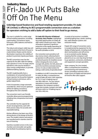 Fri-Jado UK Puts Bake Off On The Menu Uxbridge based foodservice and food retailing equipment provider, Fri-Jado UK Limited, is offering its BC5 programmable convection oven as a solution for operators wishing to add a bake off option to their food to go menus. The oven is suitable for a wide range of food retailing operations, including supermarkets, convenience stores, forecourts, QSRs, bakeries and food to go outlets. The robust and compact, table top unit may be located at the front of house to create kitchen theatre and its interior illumination maximises the visibility of product to promote impulse purchases. The BC5 convection oven has the capacity for five 400 x 600 mm baking trays spaced at 75 mm. For large volume operations units may be stacked, in space saving configurations, to provide additional baking capacity. The BC5 model benefits from a combination of convected heat and steam injection for the perfect balance of food moisture and texture, with a golden baked finish. It also incorporates a large automatic reversible fan, which ensures optimum airflow for baking consistency throughout the oven chamber. The convection oven’s user friendly controller allows precise programming of baking time, temperature and steam injection. The controller has the capacity for 25 pre-set programmes, each with three process steps, for accurate and repeatable baking. Kitchen efficiency has been one of the driving factors in the design of the BC5 oven. The model’s interior and exterior are manufactured in stainless steel for ease of cleaning. Seamless rounded corners in the oven chamber and removable rack guides also facilitate housekeeping regimes.