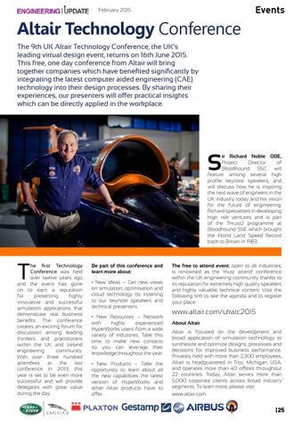 Altair Technology Conference The 9th UK Altair Technology Conference, the UK’s leading virtual design event, returns on 16th June 2015. This free, one day conference from Altair will bring together companies which have benefited significantly by integrating the latest computer aided engineering (CAE) technology into their design processes. By sharing their experiences, our presenters will offer practical insights which can be directly applied in the workplace.