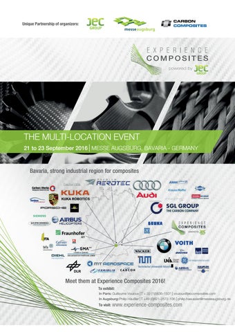 Meet them at Experience Composites 2016! To exhibit: In Paris: Guillaume Vouioux | T + 33 (1)5836-1507 | vouioux@jeccomposites.com In Augsburg: Philip Häußler | T +49 (0)821-2572-106 | philip.haeussler@messeaugsburg.de