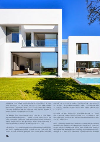 overlook the surroundings, making the most of the coast and golf course views. Living spaces seamlessly connect to outdoor terraces for optimum entertaining opportunities with prices starting from €1,275.000. For those that want something a little more bespoke Las Colinas offer buyers the opportunity to purchase plots to create your own design following the model of quality and standard synonymous with the Las Colinas resort. Olivo Community consists of a collection of fourteen plots which blend seamlessly into the lush surroundings whilst the Palmera Community, located within the heart of the resort, offers an exclusive selection of five plots for detached villas. Following unprecedented success, selling 60% of these plots in less than a year Las Colinas launched