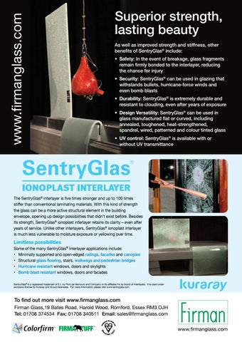 Superior strength, lasting beauty As well as improved strength and stiffness, other benefits of SentryGlas® include: • Safety: In the event of breakage, glass fragments remain firmly bonded to the interlayer, reducing the chance for injury • Security: SentryGlas® can be used in glazing that withstands bullets, hurricane-force winds and even bomb blasts • Durability: SentryGlas® is extremely durable and resistant to clouding, even after years of exposure • Design Versatility: SentryGlas® can be used in glass manufactured flat or curved, including annealed, toughened, heat-strengthened, spandrel, wired, patterned and colour tinted glass • UV control: SentryGlas® is available with or without UV transmittance