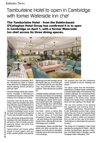 Tamburlaine Hotel to open in Cambridge with former Waterside Inn chef The Tamburlaine Hotel – from the Dublin-based O’Callaghan Hotel Group has confirmed it is to open in Cambridge on April 1, with a former Waterside Inn chef across its three dining spaces.