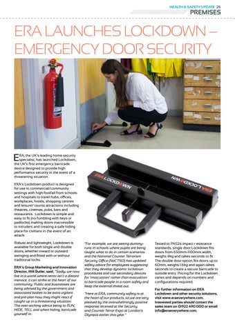 Tested to PAS24 impact r esistance standards, single door Lockdown fits doors from 650mm-1100mm width, weighs 4kg and takes seconds to fit. The double door option fits doors up to 60mm, weighs 1.6kg and again takes seconds to create a secure barricade to outside entry. Pricing for the Lockdown varies and depends on numbers and configurations required. For further information on ERA Lockdown and other security solutions, visit www.eraeverywhere.com. Interested parties should contact the sales team on 01922 490 000 or email info@eraeverywhere.com.