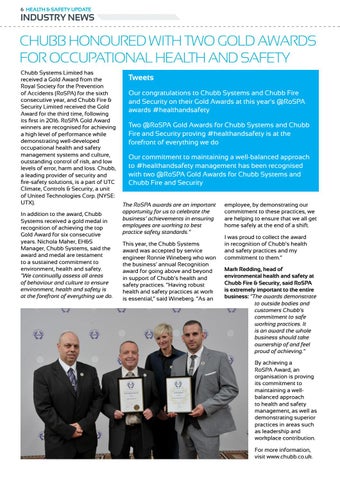 employee, by demonstrating our commitment to these practices, we are helping to ensure that we all get home safely at the end of a shift. I was proud to collect the award in recognition of Chubb’s health and safety practices and my commitment to them.” Mark Redding, head of environmental health and safety at Chubb Fire & Security, said RoSPA is extremely important to the entire business: “The awards demonstrate to outside bodies and customers Chubb’s commitment to safe working practices. It is an award the whole business should take ownership of and feel proud of achieving.” By achieving a RoSPA Award, an organisation is proving its commitment to maintaining a wellbalanced approach to health and safety management, as well as demonstrating superior practices in areas such as leadership and workplace contribution. For more information, visit www.chubb.co.uk.