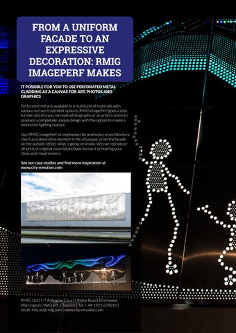 FROM A UNIFORM FACADE TO AN EXPRESSIVE DECORATION: RMIG IMAGEPERF MAKES IT POSSIBLE FOR YOU TO USE PERFORATED METAL CLADDING AS A CANVAS FOR ART, PHOTOS AND GRAPHICS Perforated metal is available in a multitude of materials with various surface treatment options. RMIG ImagePerf goes a step further and lets you recreate photographs or an artist’s vision to produce a completely unique design with the option to create a distinctive lighting feature. Use RMIG ImagePerf to emphasise the aesthetics of architecture. Use it as a decorative element in the cityscape, or let the facade on the outside reflect what is going on inside. We can reproduce all kinds of original material and look forward to hearing your ideas and requirements. See our case studies and find more inspiration at www.city-emotion.com