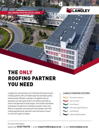 THE ONLY ROOFING PARTNER YOU NEED Langley has a proud history of combining technically sound roofing systems with unrivalled expertise and high-quality workmanship. Whether a design is straightforward or specialist, we take great pride in our ability to provide an end-to-end approach to each project, from initial consultation and design through final installation and after sales care. With our reputation cemented over five decades, we’re the roofing specialist both specifiers and contractors choose to work with, again and again.