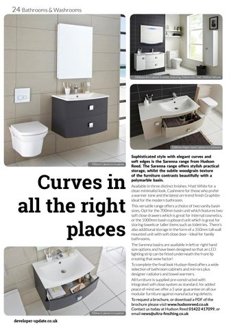 Sophisticated style with elegant curves and soft edges is the Sarenna range from Hudson Reed. The Sarenna range offers stylish practical storage, whilst the subtle woodgrain texture of the furniture contrasts beautifully with a polymarble basin. Available in three distinct finishes: Matt White for a clean minimalist look, Cashmere for those who prefer a warmer tone and the latest on-trend finish Graphiteideal for the modern bathroom. This versatile range offers a choice of two vanity basin sizes, Opt for the 700mm basin unit which features two soft close drawers which is great for internal cosmetics, or the 1000mm basin cupboard unit which is great for storing towels or taller items such as toiletries. There’s also additional storage in the form of a 350mm tall wall mounted unit with soft close door –ideal for family bathrooms. The Sarenna basins are available in left or right hand size options and have been designed so that an LED lighting strip can be fitted underneath the front lip creating that wow factor! To complete the final look Hudson Reed offers a wide selection of bathroom cabinets and mirrors plus designer radiators and towel warmers. All furniture is supplied pre-constructed with integrated soft close system as standard, for added peace of mind we offer a 5 year guarantee on all our modular furniture against manufacturing defects. To request a brochure, or download a PDF of the brochure please visit www.hudsonreed.co.uk Contact us today at Hudson Reed 01422 417099, or email news@ultra-finsihing.co.uk