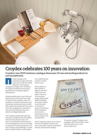 Croydex celebrates 100 years on innovation Croydex’s new 2019 centenary catalogue showcases 54 new and exciting products to suit any bathroom. t plays homage to the companies’ vintage roots with a journey through time taking inspiration from previous catalogues and logos. After 100 years of trading, the bathroom accessories specialist isn’t showing any signs of slowing down.