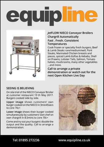 SEEING IS BELIEVING On site trial of the NIECO Conveyor Broiler at customer restaurant 19 th May 2017. Burgers cooked side by side. Upper image shows customers’ own burger cooked on the NIECO in 3min45secs to core 70c+ Lower Image shows their burger cooked simultaneously by customers’ own chef on own chargrill in 8.5mins to core 70c+ Come and try out your burgers: double the output and the quality. Call to arrange a demonstration.