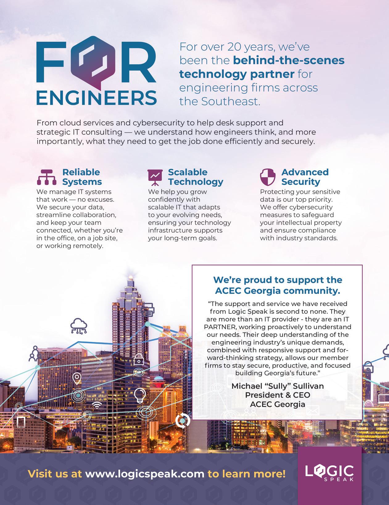 Engineering Georgia 2025 is published bi-monthly by the American Council of Engineering Companies of Georgia (ACEC Georgia) and its partner associations ASCE, ASHE, GEF, GSPE, ITE, ITS, SAME, SEAOG, SMPS and WTS. All rights reserved. Reproduction in whole or part without permission is prohibited.