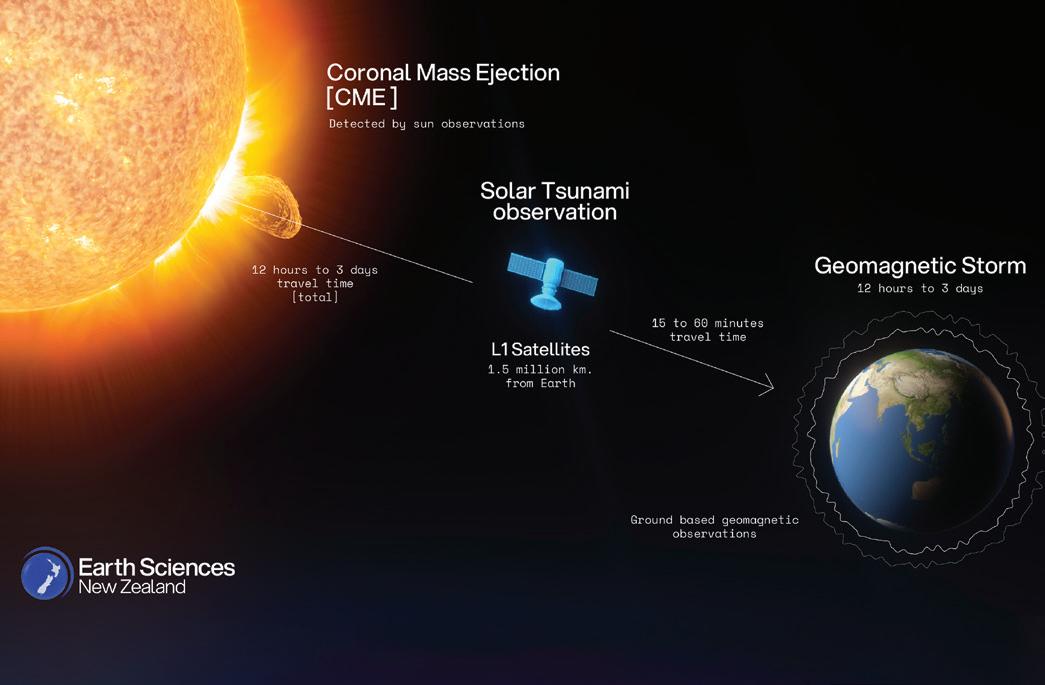Opposite: Diagram showing the travel time for solar activity from the Sun to L1 satellites, and satellites to Earth, where the activity is picked up by magnetometers. This warning allows organisations like Transpower to engage their contingency plans for geomagnetic storms. Image: Earth Sciences New Zealand.
