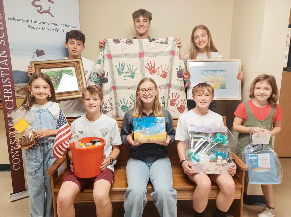On Oct. 18, breakfast items and individual apple dumplings will be offered for sale at the Cougar Cafe. There will also be a Cougar Grounds coffee area offering hot coffee, cold brew, hot cider and hot chocolate. The live auction on Oct. 18 will be held from 9 a.m. until the last item is sold. On the auction block will be handmade quilts, experiences and homemade jams and yogurt. Also featured will be artwork, some made by the students themselves. Eighth-grader Ella Perechinsky created a painting for the auction that features a colorful sunset done in acrylics. The artwork also includes Psalm 19:1, which states, “The heavens declare the glory of God; and the firmament sheweth His handywork.” ”I drew it first with pencil, and then I went over it with paint,” Ella noted. In addition, each class at the school has designed a themed basket for the auction. Basket themes this year will include Date