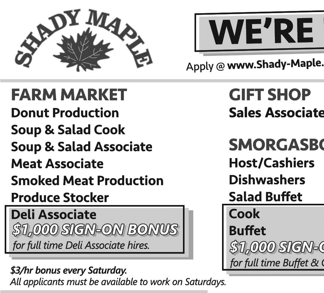 Holiday Craft Show Craft Show & Cookie Walk & Sat., December 3 Sat., December 3rd rd , 2022 , 2022 8:30 a.m. to 1 p.m. 8:30 a.m. to 1 p.m. Featur in g: Featuring: • Cookie Walk 8:30am •Until S old O ut Sold Out • Vendors with • Handmade Cra fts Handmade Crafts • Food Items for Sale • Food Items Sale • B aked G oods • Baked Goods • C hildren’s Cookie • Children’s Decorating A rea Decorating Area • Kid ’ s S hopping Cor ner • Kid’s Shopping Corner R090529 R090 529 Zion Lutheran Church 18 Quarry Road Leola, PA 17540 www.zionleola.org Phone: 717-656-9200 Wood crafts Moisturizing products Holiday crafts Home décor Jewelry Clothing accessories R090281 GOLD BUYING WE MAKE HOUSECALLS! ANY CONDITION (717) 587-7487 Buying: Gold • Sterling Costume Jewelry • Vintage Watches R090081 LANCASTER BICYCLE SHOP 1138 MANHEIM PIKE 717-299-9445 SHOP SMALL SHOP LOCAL lancasterbicycleshop.com SALE 25% OFF up to some exclusions apply Made by MTD BE PREPARED FOR SNOW Bird-in-Hand, PA 17505 717-768-3729 R090376 Can of 50 Fuel FREE with any Back Pack Value of $20.00 or Handheld Blower Value of $10.00 ECHO BLOWER 24" Starting at $79999 See store for more models. R090180 During New Holland’s Christmas on Main Saturday, December 3rd Christmas Bazaar New Holland United Methodist Church 120 West Main Street 9AM-6PM HOLIDAY CRAFTS • FOOD Pulled Pork, Mac & Cheese USED BOOK SALE ATTIC TREASURES including Nice Furniture VISIT OUR WEBSITE AT www.townlively.com R087428 Published By Engle Printing & Publishing Co., Inc. PUBLISHED WEDNESDAYS The Penny Saver reserves the right to reject any advertisement. The Penny Saver assumes no financial responsibility for any typographical errors in advertisements but will reprint that portion of an ad in which error occurs. Advertisers submitting artwork and images for use in advertisements assume all liability in regards to trademark and copyright infringements. We encourage civic and fraternal groups, schools, churches, scouts, and other local organizations to submit news releases of general interest to the majority of our readership. Primary consideration is given to dated articles of an informative nature–activities and events of local interest sponsored, presented, or planned by area organizations and institutions. Related photographs of good quality are encouraged also, but complete picture identification must be included. Undated articles of general interest are used as space permits. All articles must contain a contact name and telephone number. Submit Camera Ready Ads at: engleonline.com sales@engleonline.com Display Advertising Deadline 11 A.M. Thursday Display Ad Customer Service 717-492-2530 Fax 717-492-2580 News Deadline 10 A.M. Wednesday News Department 1-800-800-1833 Extension 6018 Circulation / Distribution Customer Service 1-800-800-1833 Extension 6014 Mailed outside our circulation area for $36.00 a year. Send news requests to: Penny Saver Editor Engle Printing & Publishing Co., Inc. P.O. Box 500 Mount Joy, PA 17552 or submit by email to news@engleonline.com circulation@engleonline.com CONESTOGA VALLEY EDITION Submit Classified Ads at: townlively.com 1-800-428-4211 classifieds@engleonline.com Classified Advertising Deadlines By phone 10 A.M. Thursday Online Noon Wednesday (Except Early Holiday Deadlines) See ULTWMA pg 3