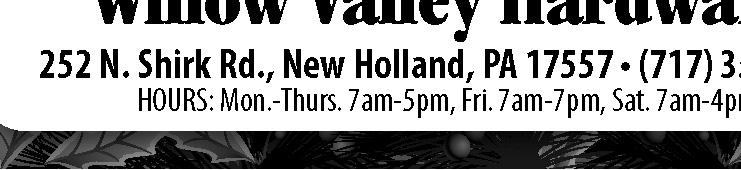 PENNYSAVER - Conestoga Valley Edition - December 7, 2022 - 3 townlively.com R090868 Great Deals on Toys, Coats & Clothing w/tags on, Furniture, Electronics, Kitchen Items & More! Assorted Socks $2.00 per Dozen Bargain Christmas Gifts! Buy in Bulk! Buy Discounted Food by the Pallet! Big Sale - Bouillon/Spicy Snacks! Russell Stover Chocolate $3.00/case Also, Entire Bins for sale 79 Elmwood Avenue Landisville, PA 17538 INVENTORY LIQUIDATION THURSDAY, DECEMBER 15 12:00 NOON-7:00PM FRIDAY, DECEMBER 16 7:30AM-2:30PM R090439 Christmas 10 OFF Storewide Willow Valley Hardware 252 N. Shirk Rd., New Holland, PA 17557 • (717) 354-8338 HOURS: Mon.-Thurs. 7am-5pm, Fri. 7am-7pm, Sat. 7am-4pm Excludes Specials DeWalt Batteries & Tools, MillerTech Head Light, Ping Pong Tables, Trikes, Dump Wagon, Scooters, Lifetime Tables or Benches, Homemade Butter & Cheese Dec. 12th - 22nd Closed Sat., Dec. 24th Sale 28% OFF Lifetime Chairs Sale Price $32.00 Regular $45.00 R089110 Tools. Not Toys. GAP POWER Sales & Rentals Rt. 30 - 5399 Lincoln Hwy., Gap, PA 717-442-8970 www.gappower.com ESH HARDWARE & FARM SUPPLY 64 Clearview Rd., Ronks, PA 717-768-8497 WES STAUFFER EQUIPMENT 23 Pleasant Valley Rd., Ephrata, PA 17522 717-738-4215 www.wesstauffer.com ASK ABOUT 7 DAY SATISFACTION GUARANTEE Chain Saws From $19999 GAS TRIMMER This lightweight balanced design features a semi-automatic 2-line Autocut® head. $29999 FS 38 $14999 Optional Attachments: Hedge Trimmer • Power Scythe Pole Saw • Cultivator • Lawn Edger HS 45 18" HEDGE TRIMMER $22999 SH 56 SHREDDER VAC/BLOWER BG 50 BLOWER $14999 MS170 - 16" bar Larger Models on Sale! PUT A UNDER THE TREE R090202 32 S. Belmont Rd. Paradise, PA 17562 (1⁄2 mile South of Rt. 30) 717-687-8756 LLC Christmas at WINTER HOURS: 8:00am-5:00pm Thru Dec. Friday 8:00am-8:00pm, Closed Sunday • Poinsettias • Table Centerpieces • Winter Arrangements Large and Small • Handmade Bows • Houseplants • Ceramic Pots • Gift Certificates • Macrames • Party Lite Candles • Hammock Chairs 9-5 Shipping Available Taking Orders Now! Free Hot Chocolate & Cookies Every Friday Open till 8pm Relax & Enjoy Partylite Candles! Buy 3 Washes Get 1 FREE Hurry, Offer Ends 12/31/22 CHRISTMAS SPECIAL G r e a t G i f t I d e a ! Great Gift Idea! HIGHLAND CAR WASH SELF SERVICE - TOUCHLESS AUTOMATICS OPEN 24/7 #1 STANDARD WASH $6.00 717-299-9274 Call us for information or stop by Christmas Hut on site TWO LOCATIONS Located on Rt. 772 next to Sheetz at Rt. 272, Brownstown Corner Of Rt. 30 & 340 (Behind Sunoco A+) 1962 Old Philadelphia Pike Touchless Laser Washes at Both Locations! #2 DELUXE WASH $8.00 #3 PREMIUM WASH $10.00 #4 ULTIMATE WASH $12.00 CVEF Grants Fund Projects BASIS (Brothers and Sisters in Support), a support group for bereaved parents, will meet on Tuesday, Dec. 13, at 7 p.m. Attendees will share in a discussion on “Celebrating Christmas Through the Comfort of the Christmas Bells.” For directions and details, call Calvary Monument Bible Church at 717-442-8161. Parent Support Group To Meet