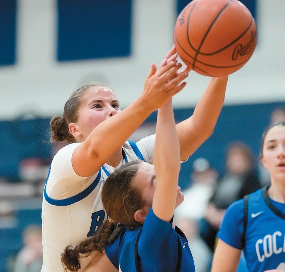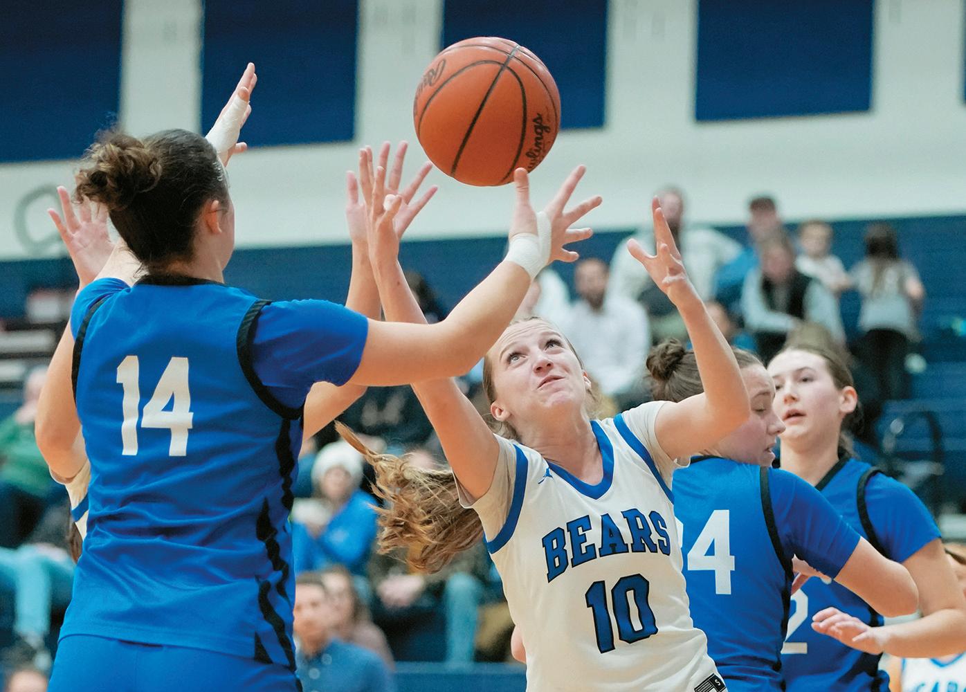 On Thursday, February 5, the Bears’ Allison Krebs looks to pass the ball between Eagles Abbey Eppinette (24) and Tatiyana Medina (13) during a 50-15 loss on Thursday, February 5, at home.