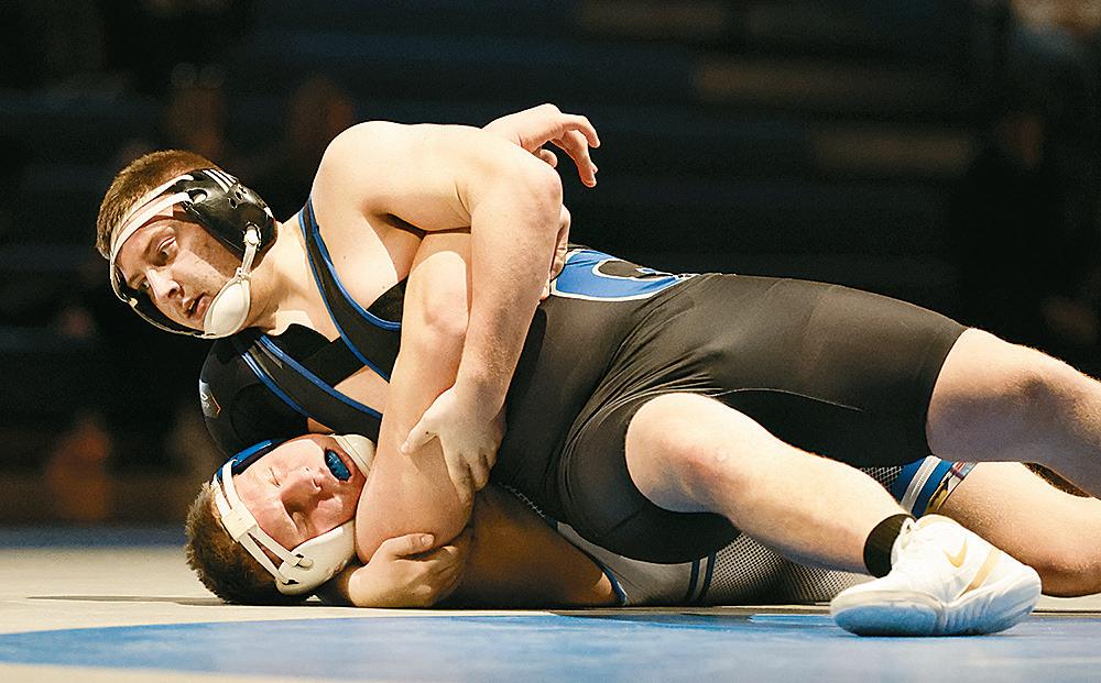 On Monday, January 19, Garden Spot’s Vernon Toaltoan (189) ties up LampeterStrasburg’s Mitchell Swarr for the pin during a 39-19 triumph in New Holland.