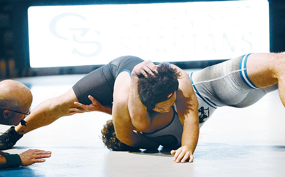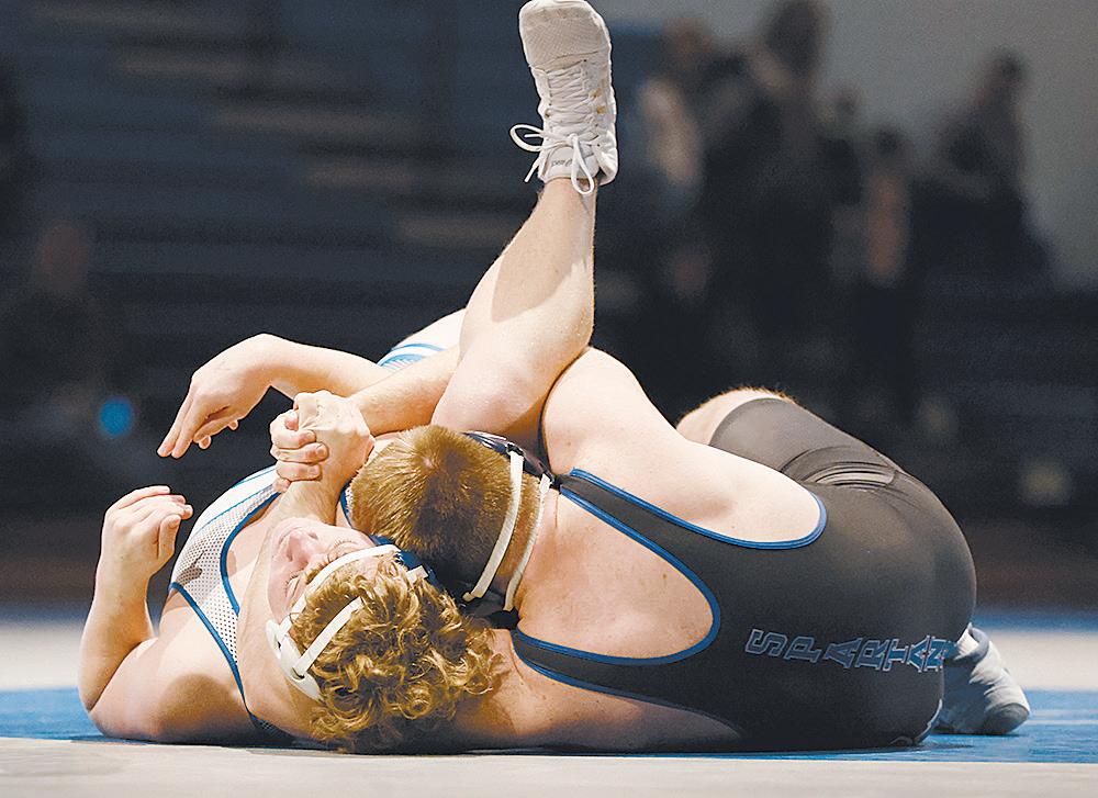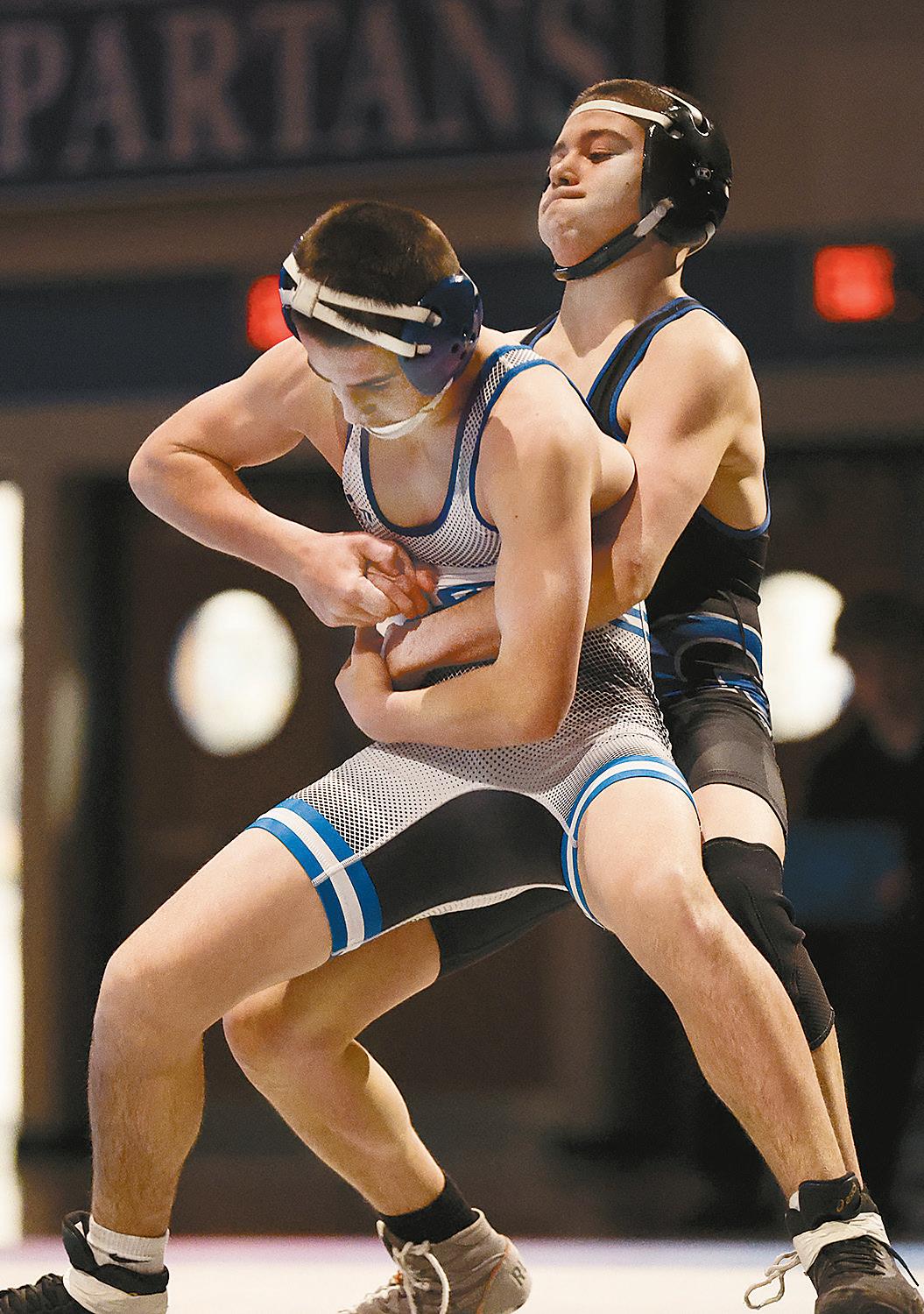 Under the spotlight, the Spartans’ Marshal Sensenig (121) prepares to throw down Lampeter-Strasburg’s Connor Shenk to win by major decision 14-0 on Monday, January 19.