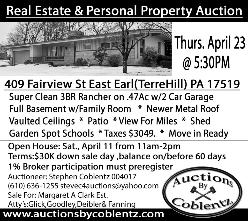 PUBLIC SALE TO SATISFY LIEN OF EARL'S COURT SELF STORAGE VIA AUCTION. APRIL 10 6:00 PM @ 684 W MAIN ST, NEW HOLLAND. SOUDEN, BOBBI JO 115, KENEDY, AKEYA 95, LUCAS, LEXI 88. WINNING BIDS MUST BE PAYED AT TIME OF SALE. QUESTIONS: 717-790-1234