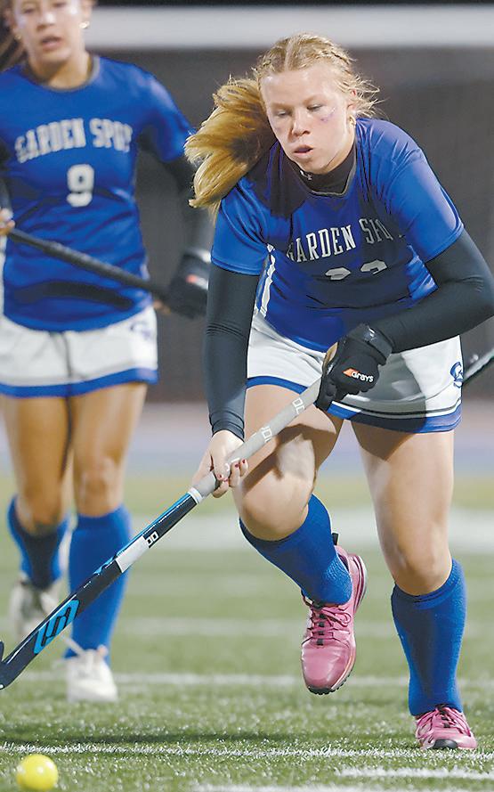 Under the lights, Garden Spot’s Ava Nagle battles Lancaster Country Day’s Maddy Green during a 5-0 loss on Thursday, October 9.