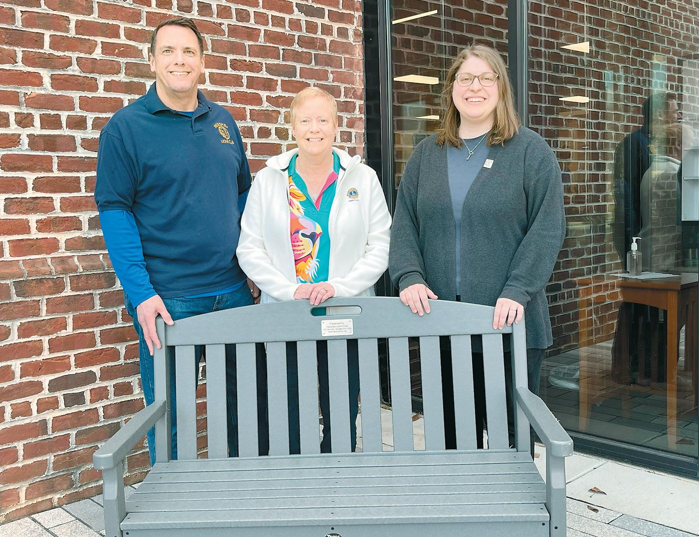 John Mallonee (left) and Kelly Mallonee (center) of the Hershey Lions Club and Alison Jacobine of the Hershey Public Library gather at the new bench.