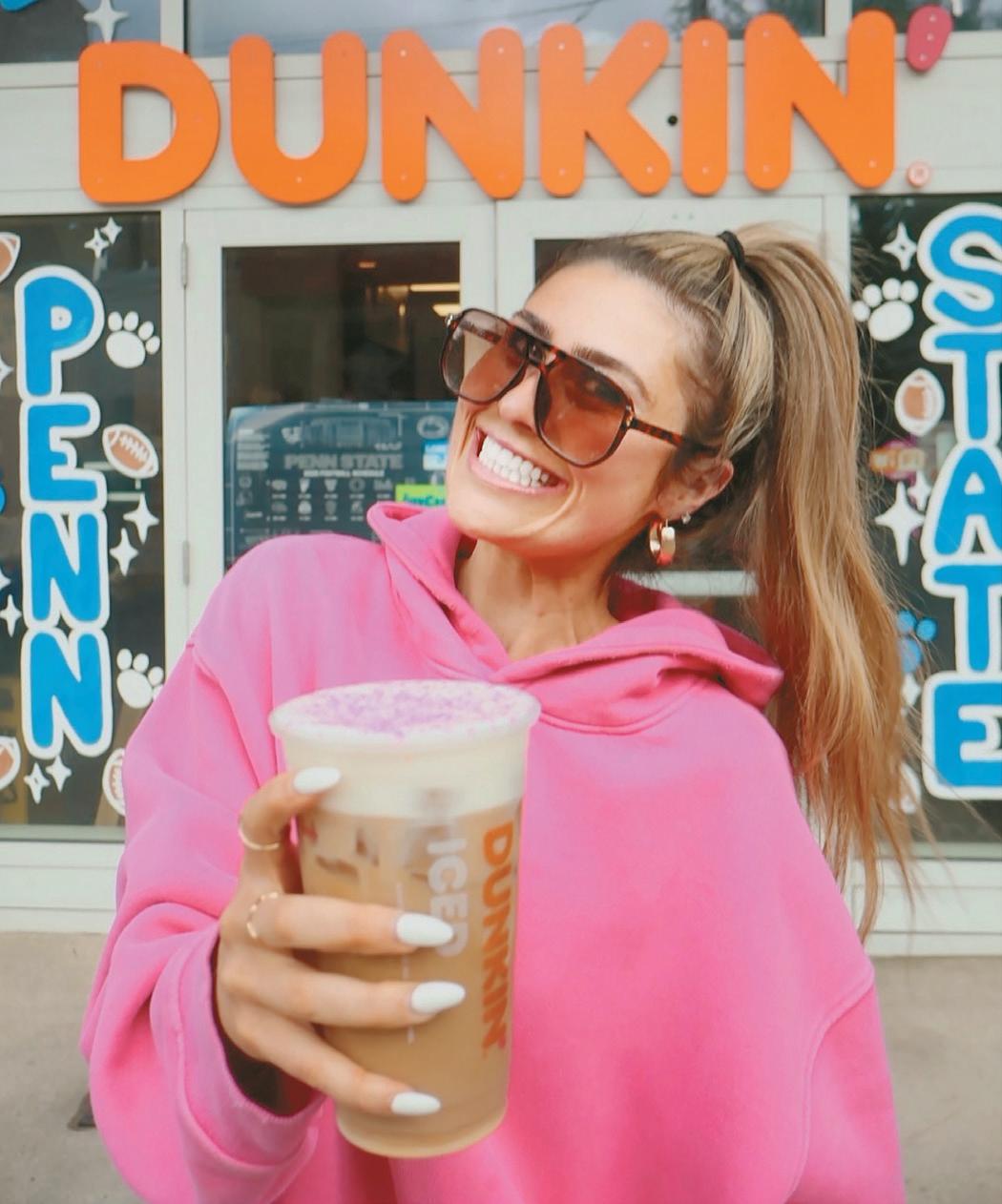 Megan’s biggest claim to fame is a partnership with State College Dunkin’ shops, which sell “The Megan Million,” an iced coffee that consists of two vanilla beans, two French vanilla swirls, almond milk, sweet cream cold foam, and pink sprinkles on top.