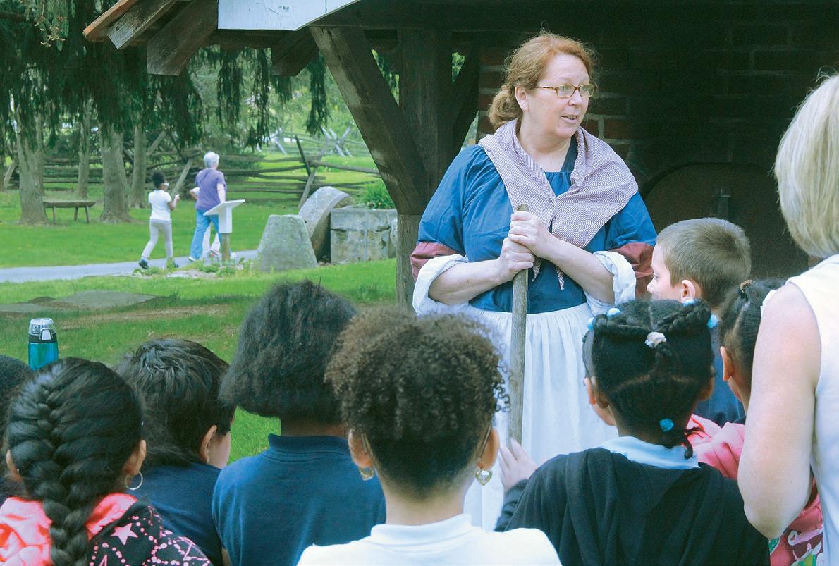 surrounded by the Lancaster Longhouse, a blacksmith shop, a visitor’s center, a pasture and horse barn and an orchard.