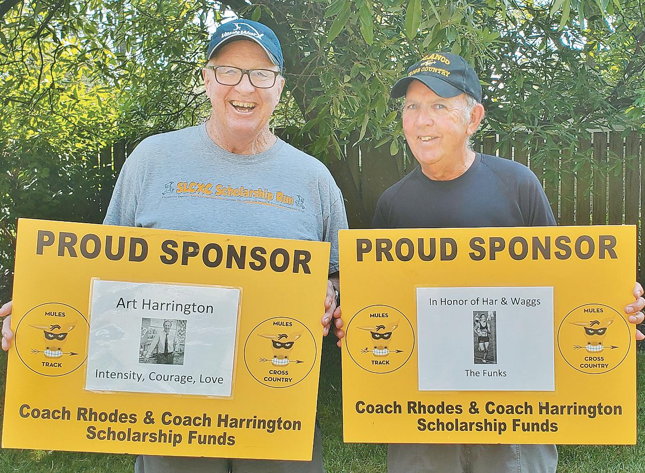 Former head coaches Art Harrington (left) and John Waggoner display the Solanco Cross-Country and Track and Field Alumni Associations’ scholarship sponsor signs.