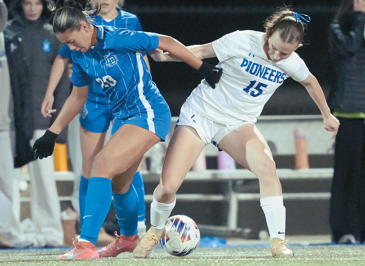 Under the lights, Pioneers’ Brianna Jackson beats Lower Dauphin’s Makenna Haldeman to the ball in a 5-1 loss during the District Three quarterfinals on Thursday, October 23.