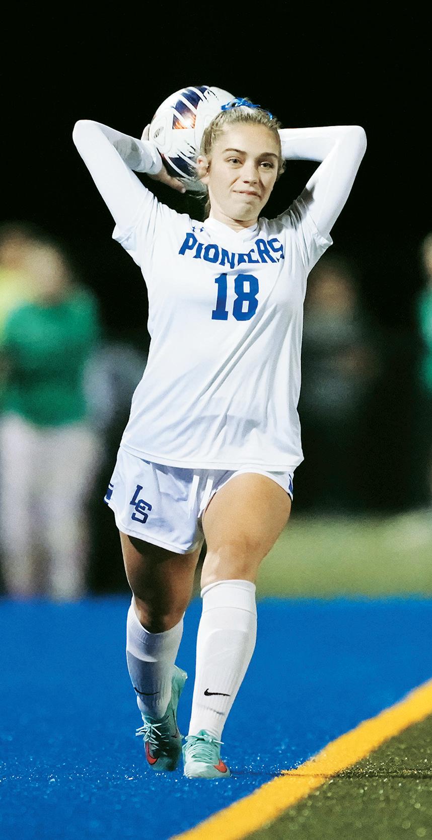 Jillian Groff sends the ball down the field for the Pioneers against Lower Dauphin in a 5-1 loss during the District Three quarterfinals on Thursday, October 23.