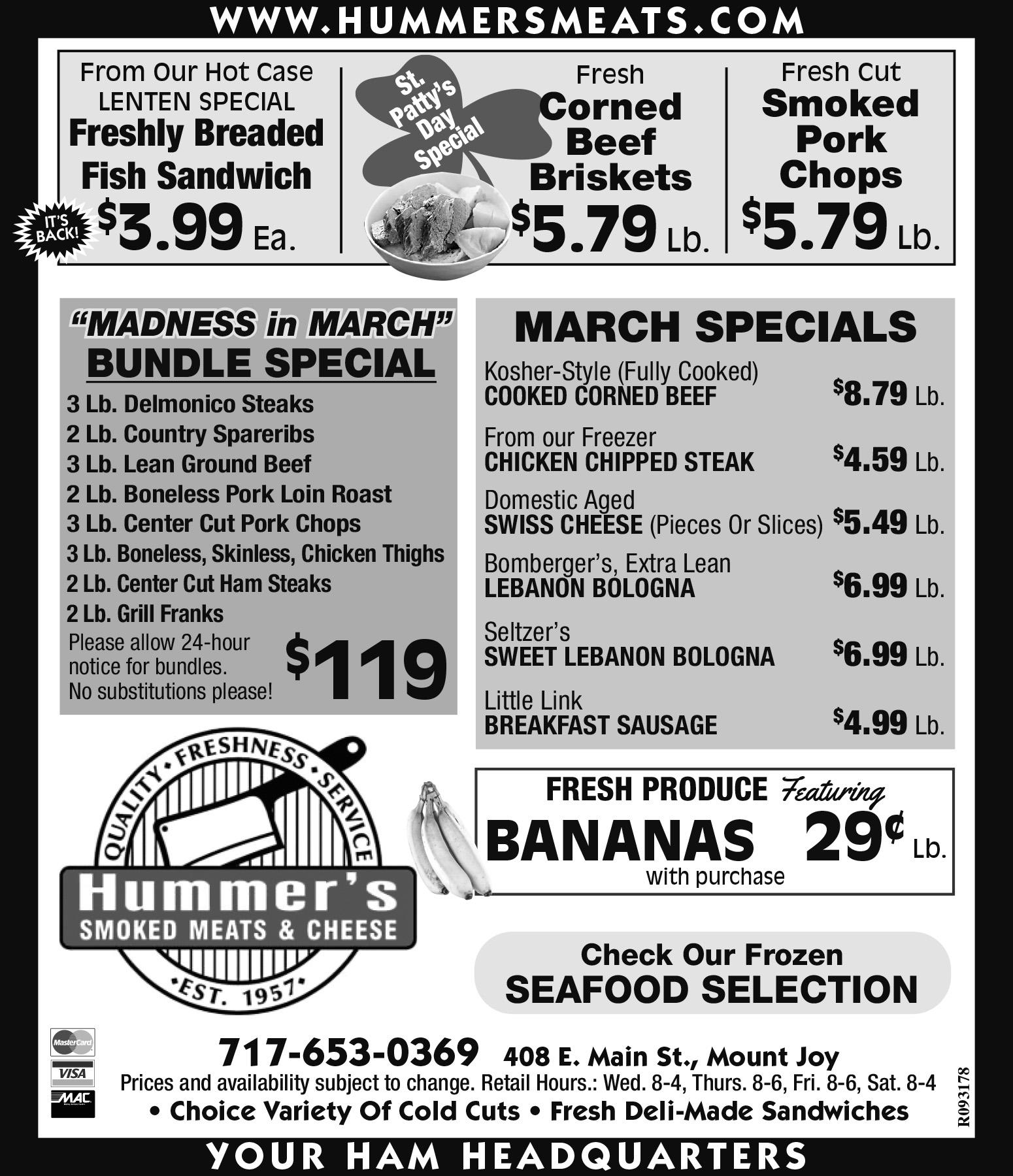 Old Line Road, Manheim www.haldemanmechanical.com PLUMBING - HEATING - COOLING WATER CONDITIONING Sales and 24-Hour Service PA7777 Protecting Your Home for 84 Years! Since 1939 R092067 We S t o c k B u l k F l o u r, S u g a r, & O a t m e a l Stock Bulk Flour, Sugar, & Oatmeal 3 2 2 G E N E R A L S T O R E 322 GENERAL STORE CA L L T O O R D E R 7 1 7 - 4 4 9 - 4 8 0 2 ALL TO ORDER 717-449-4802 *Prices & Availability Subject to Change One Week from Publication or While Supplies Last. Payment Expected On Delivery. (CASE LOT SALES ONLY) DELIVERY ONLY! R093101 FREE DELIVERY $75 OR MORE $200 Order Receive FREE Giant Candy Bar $300 Receives 2 FREE Candy Bars Monterey Jack Cheese Block 12/8 oz. $2.99 lb. Chicken Drumsticks ................................37 lb. avg. 99¢ lb. Seasoned Boneless Skinless Chicken Breast ..6/5 lb. $2.49 lb. Boneless Skinless Chicken Tenderloins .....2/5 lb. $2.49 lb. Boneless Skinless Chicken Thighs ......20 lb. avg. $1.79 lb. Boneless Skinless Chicken Breast.......30 lb. avg. $1.99 lb. Uncle Bud’s Chicken Wings....................12/2.5 lb. $1.79 lb. Chicken Patties (Fully Cooked) ......................20 lb. $1.49 lb. Ground Turkey............................................. 4/5 lb. $1.99 lb. Oscar Mayer Sliced Sandwich Turkey ........ 12 lb. $1.29 lb. Kunzler Turkey Franks ................................. 10 lb. $2.49 lb. Turkey Bacon .......................................... 12/8 Oz. $2.49 lb. Uncured Turkey Bologna .................................10 lb. 99¢ lb. Nice Hot Ham ...........................................10 lb. avg. 99¢ lb. Hatfield Hardwood Smoked Bacon ...........12/1 lb. $3.29 lb. Applegate Organic Uncured Bacon ..........12/8 oz. $3.49 lb. Johnsonville Brats (Fully Cooked) ...........10/14 oz. $1.49 lb. Sliced Smoked Ham.....................................6/2 lb. $1.49 lb. Sausage Links (Fully Cooked) ........................10 lb. $1.79 lb. Jimmy Dean Hot Sausage Roll ..................12/16 oz. 99¢ lb. Oscar Mayer Honey Ham .........................3.375 lb. $1.49 lb. Oscar Mayer Smoked Bacon ..................12/12 oz. $3.29 lb. Bone-In Hams ..................................................27 lb. 99¢ lb. Hatfield Hams .......................................13 lb. avg. $1.49 lb. Butcher Wagon Ham Steaks................ 20 lb. avg. $1.10 lb. Bone-In Pork Chops .....................................10 lb. $1.99 lb. Ground Pork Sausage ...............................12/1 lb. $1.99 lb. Jimmy Dean Sausage Patties 22.5 lb. fully cooked $1.99 lb. Smithfield Premium Sausage ........orig. 12/16 oz. $1.49 lb. Sliced Pepperoni ...........................................25 lb. $1.99 lb. Nice Beef Franks...........................................10 lb. $1.49 lb. Philly Cheesesteak Slices ............................10 lb. $2.49 lb. 75/25 Ground Beef ....................................2/10 lb. $2.99 lb. Hard Salami Ends and Pieces .........................40 lb. 79¢ lb. Salted Butter .................................................12 lb. $3.69 lb. Sliced Cheddar Cheese ............................ 12/8 oz. $2.29 lb. Horizon Organic American Singles ..........12/8 oz. $3.69 lb. American Cheese (Block) .............................6/5 lb. $2.69 lb. Sliced White American Cheese ................12/8 oz. $2.49 lb. Shredded Pizza Blend ..................................4/5 lb. $1.99 lb. Shredded Mozzarella Cheese ......................4/5 lb. $2.49 lb. Shredded Cheddar Cheese ..........................4/5 lb. $2.99 lb. Baby Swiss Block ........................................2/8 lb. $3.49 lb. Longhorn Cheese Roll ...................................13 lb. $2.99 lb. Ice Cream Pails ..........................................3 gal. $17.99 ea. Yogurt Cups $2.99 case Raw Honey ........................................2/22 oz. jars $4.99 ea. Jumbo Lump Crab Meat ...............................1 lb. $12.99 lb. Battered Shrimp (Fully Cooked) .....................10 lb. $2.99 lb. Breaded Fish Nuggets (Fully Cooked)....10 lb. case $1.79 lb. Nice Fish Filets .............................................16 lb. $2.99 lb. Organic All-Purpose Flour ...............................50 lb. 69¢ lb. Occident Flour ..................................................50 lb. 80¢ lb. White Sugar .....................................................40 lb. 89¢ lb. Extra Smooth Peanut Butter .......................2.2 lb. $1.79 lb. Oatmeal ............................................................50 lb. 70¢ lb. Sliced Hard Salami 12/8 Oz. $1.49 lb. For Day or Evening Appointments call (717) 653-0003 75 East Main Street, Mount Joy, PA 17552 www.staceywbettslaw.com YOUR LOCAL ATTORNEY STACEY W. BETTS ATTORNEY AT LAW Over 30 Years Experience • Wills, Trusts & Estates • Family Law • Education Law • Business Law • Real Estate • Personal Injury Law R064722 BOLD. DISTINCTIV E. BI BLICAL. 120 College Ave., Mountville, PA 17554 Daysprin gChristian.com ALL SCHOOL OPEN HOUSE Thursday, MARCH 16 6:00 P.M. Register at DAYSPRINGCHR ISTIAN.COM or call 717.285.2000 PRESCHOOL THROUGH GRADE 12 TODAY IN SCHOOL, I made history. DAYSPRING CHRISTIAN ACADEMY@DAYSPRINGCADAYSPRINGCHRISTIAN R093131 VISIT OUR WEBSITE AT www.townlively.com R087421 Published By Engle Printing & Publishing Co., Inc. PUBLISHED WEDNESDAYS The Merchandiser reserves the right to reject any advertisement. The Merchandiser assumes no financial responsibility for any typographical errors in advertisements but will reprint that portion of an ad in which error occurs. Advertisers submitting artwork and images for use in advertisements assume all liability in regards to trademark and copyright infringements. We encourage civic and fraternal groups, schools, churches, scouts, and other local organizations to submit news releases of general interest to the majority of our readership. Primary consideration is given to dated articles of an informative nature–activities and events of local interest sponsored, presented, o