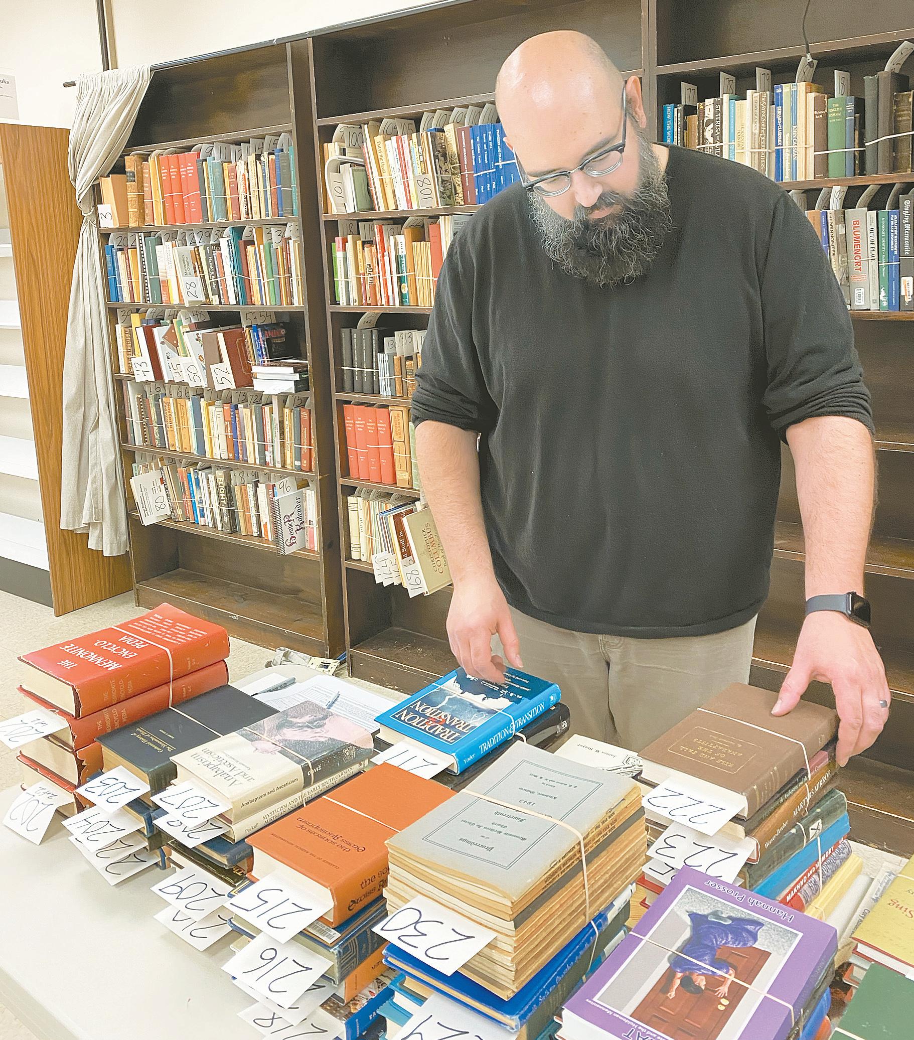 Mennonite Life’s used books manager, Kevin Bradford, looks through books that will be sold at the auction.