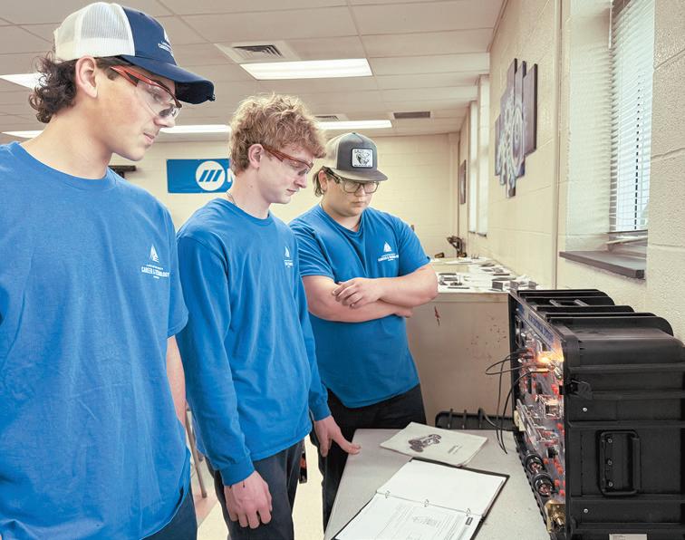 Mason Sload of Donegal (left) and Elizabethtown Area High School students Kowen Spigelmeyer (middle) and Preston Powell observe machinery. Photo by George Deibel
