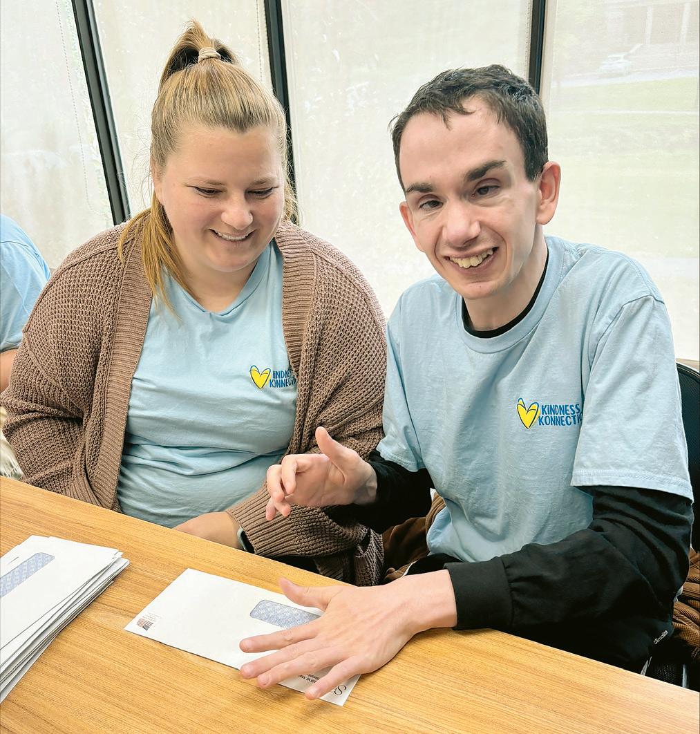 Taylor Warner (left) and Ben Morganstein work on a mass mailing project as part of Aaron’s Acres’ Kindness Konnections program.