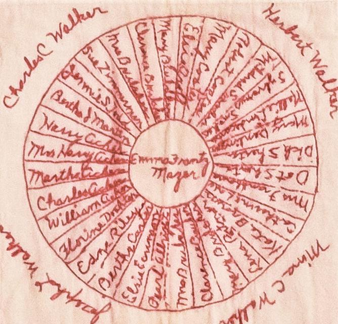 According to Bud, the Gap chapter encouraged people of the township to pay to have their names embroidered on squares in the pie design of the coverlet. People paid 5 cents to have their name within the circle and 25 cents for their name to be on the perimeter of the circle. The squares eventually were joined together to form the coverlet. The finished project was then auctioned off, financing the local chapter’s participation in the national movement to promote abstinence from drinking alcohol and other reforms in the area