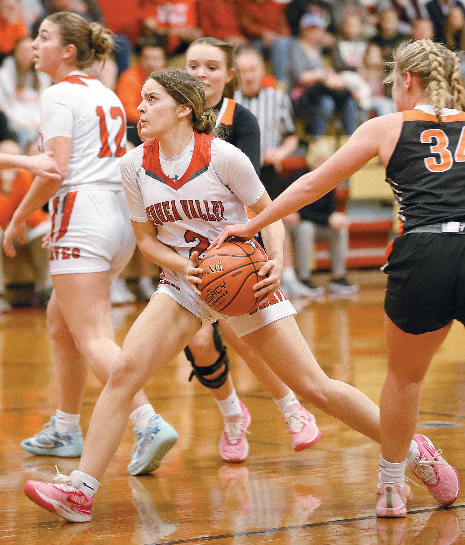 Confronted by a trio of Upper Dauphin defenders, Janae Patterson of Pequea Valley passes the ball during the Braves’ 49-42 triumph in the opening round of the District Three Class AAA playoffs on Monday, February 19. Patterson posted 10 points in the win.