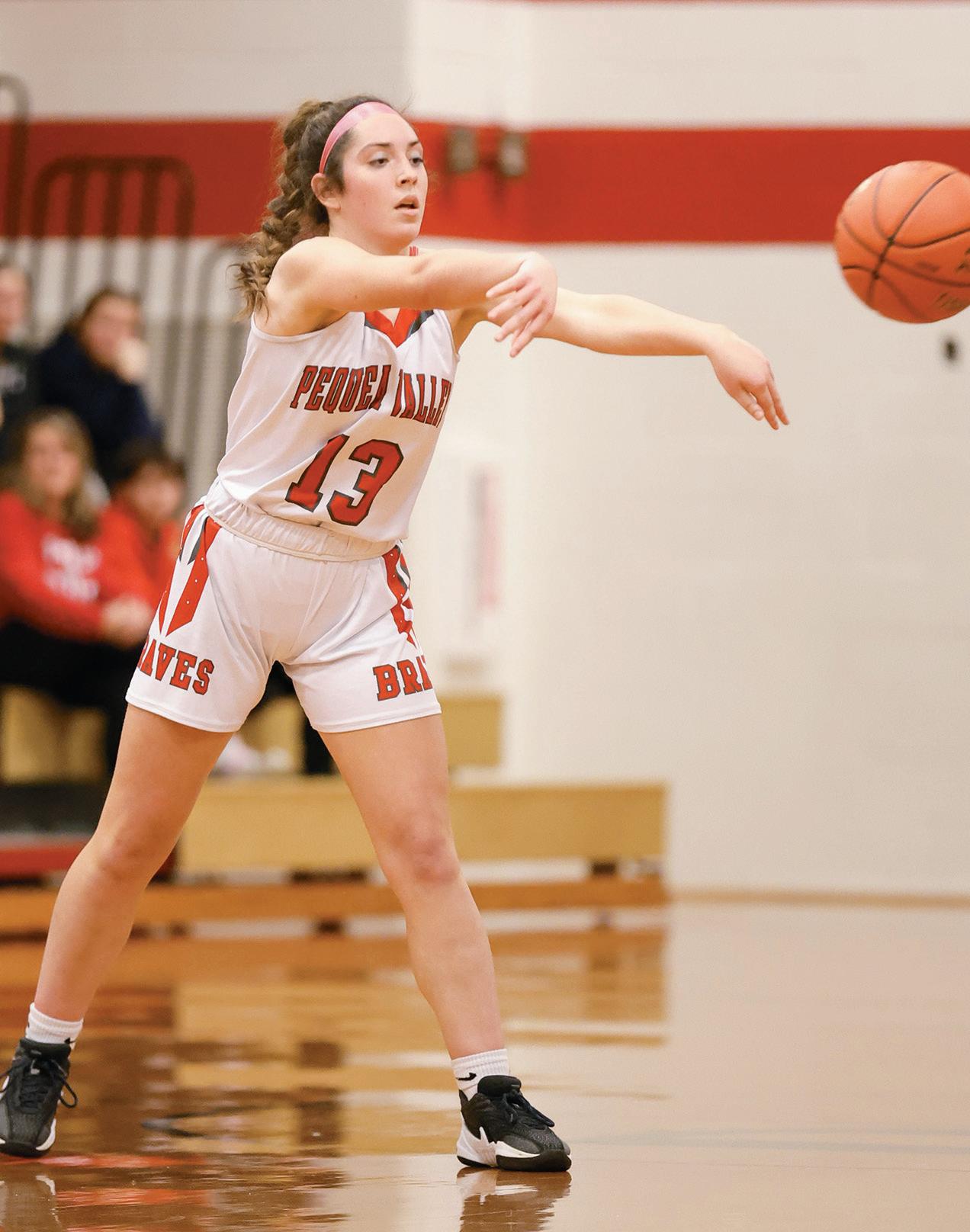 The Braves’ Morgan Graham whips a pass to an open teammate on Monday, February 19, in the opening round of the District Three Class AAA playoffs. The Braves defeated Upper Dauphin 49-42.