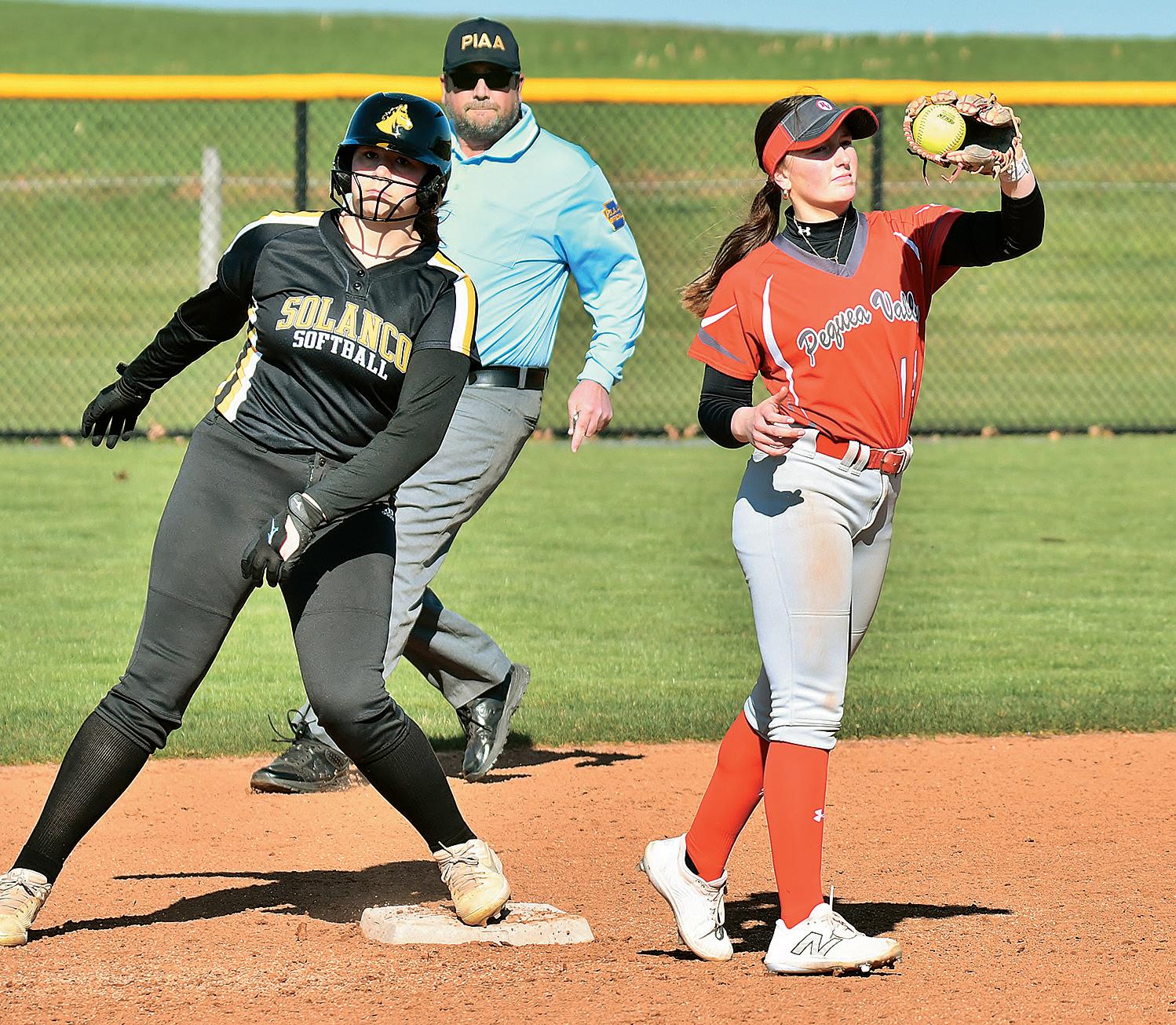 Pequea Valley shortstop Isolde Graham corrals a late throw at second base, as Solanco’s Delaney Gote stands safely on the bag. The Braves fell to Solanco 18-0 on Monday, March 25 in Kinzers.
